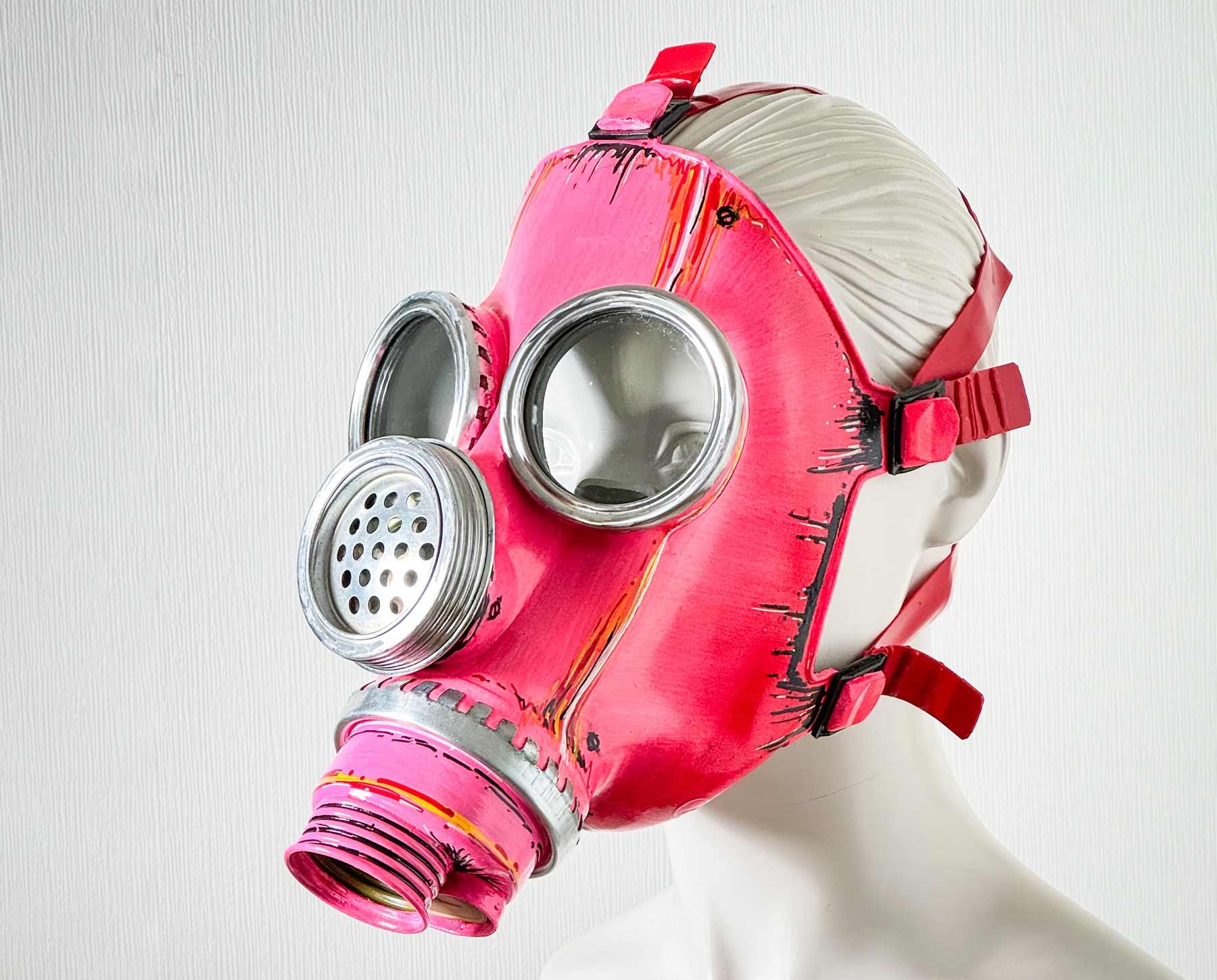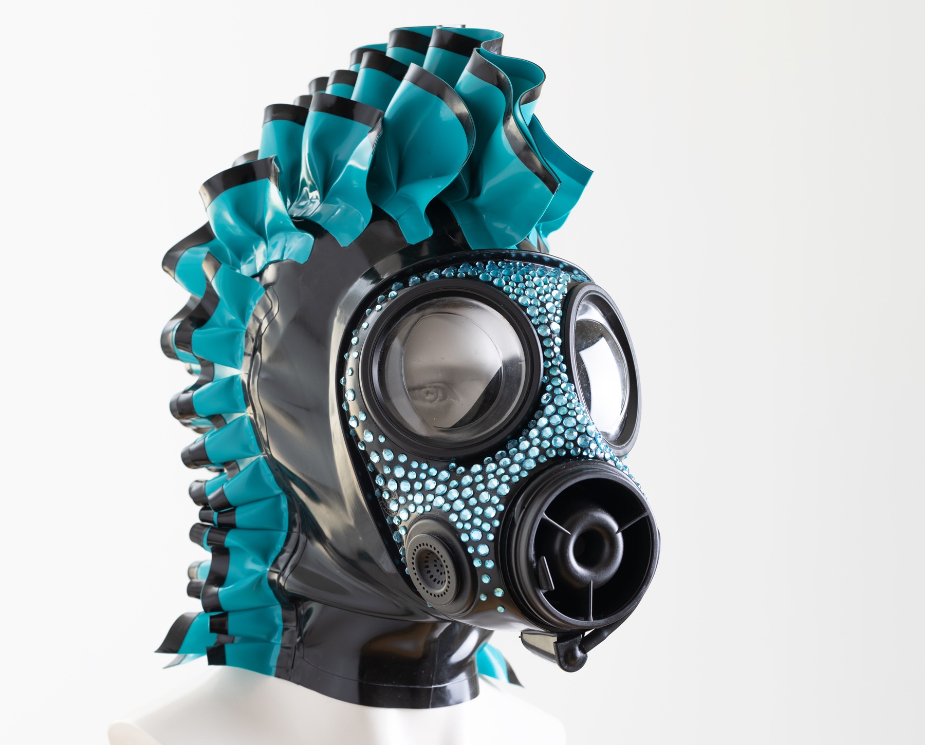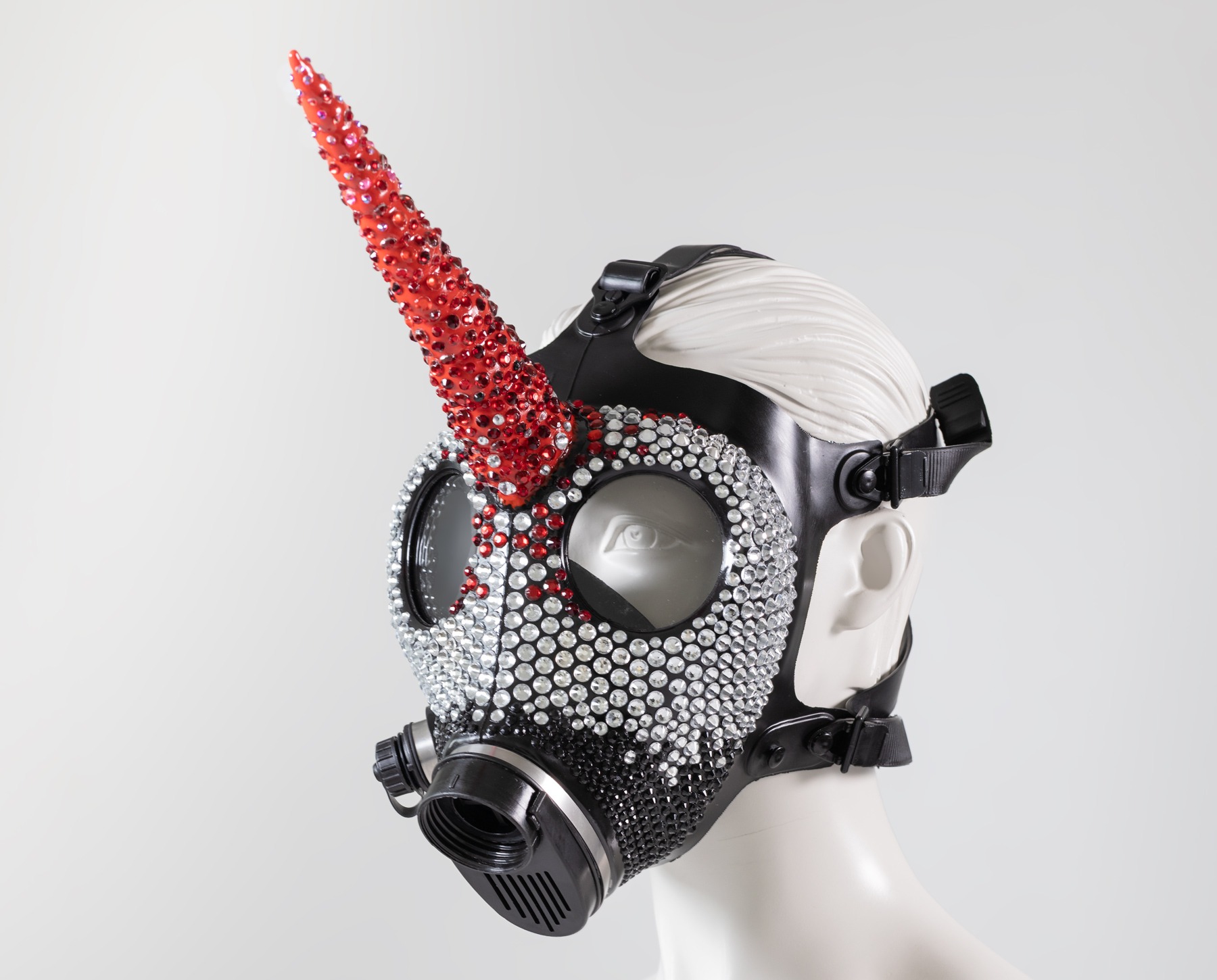 Weiße Gasmaske mit Strass Steine und einem schwarzen Latex Horn.