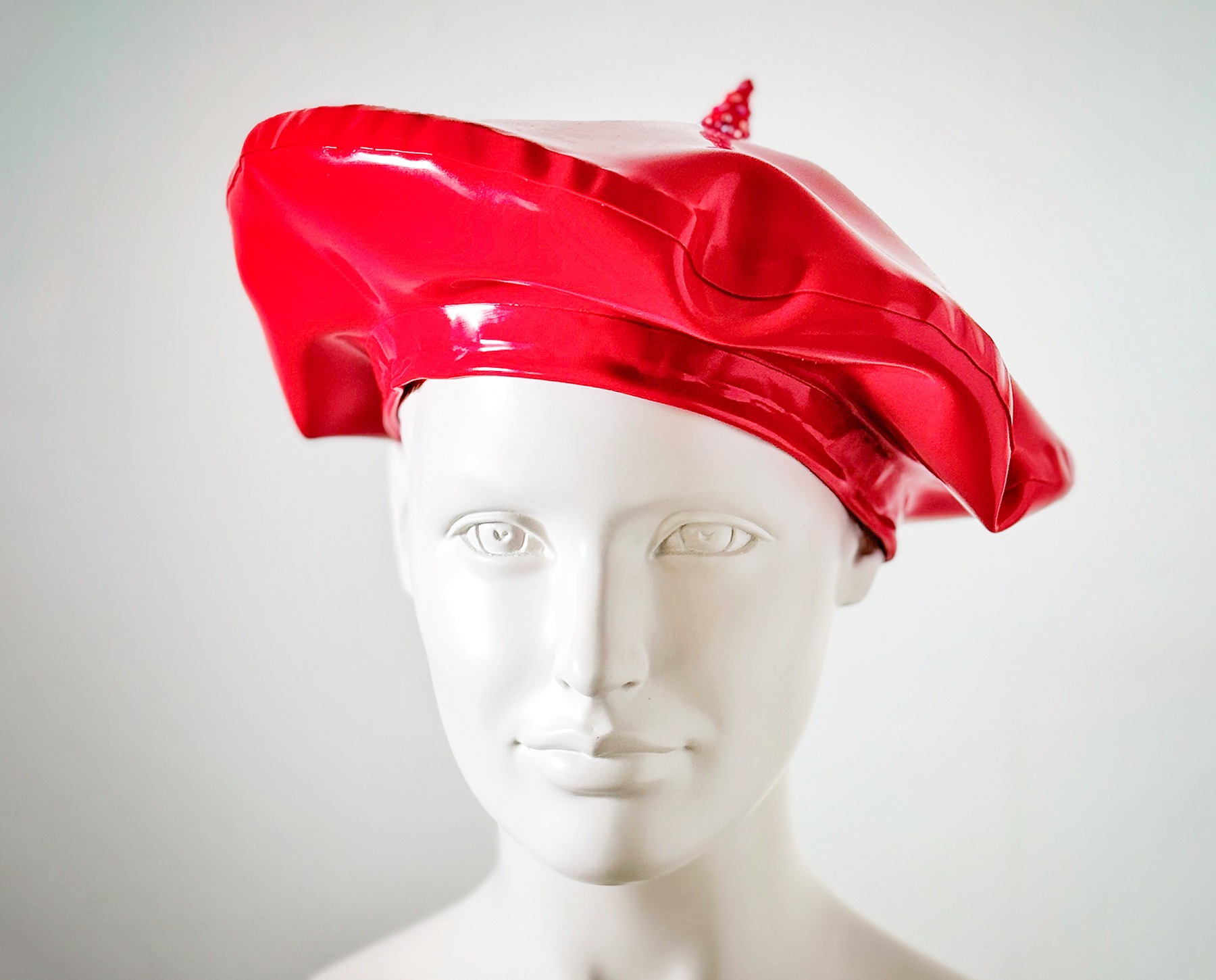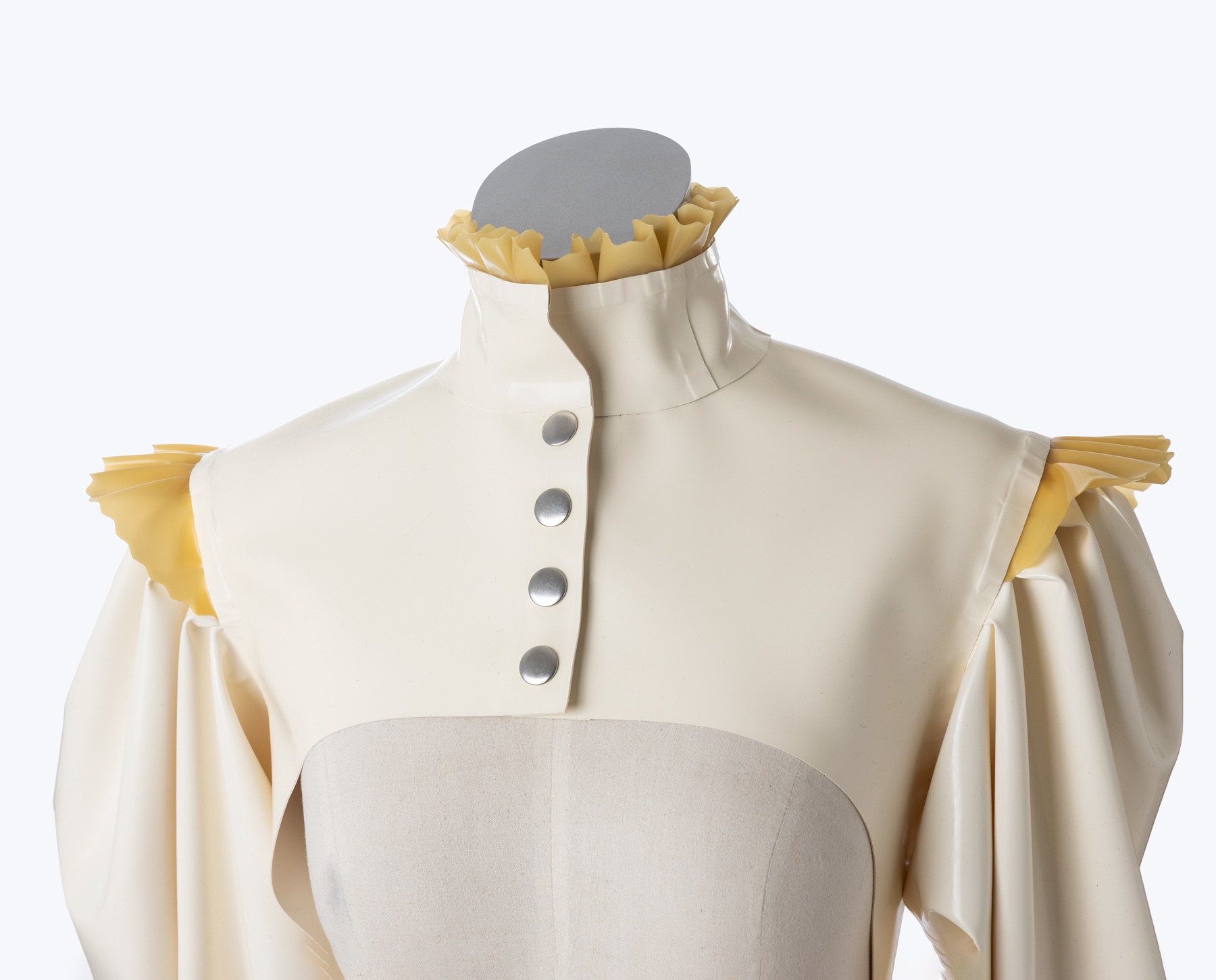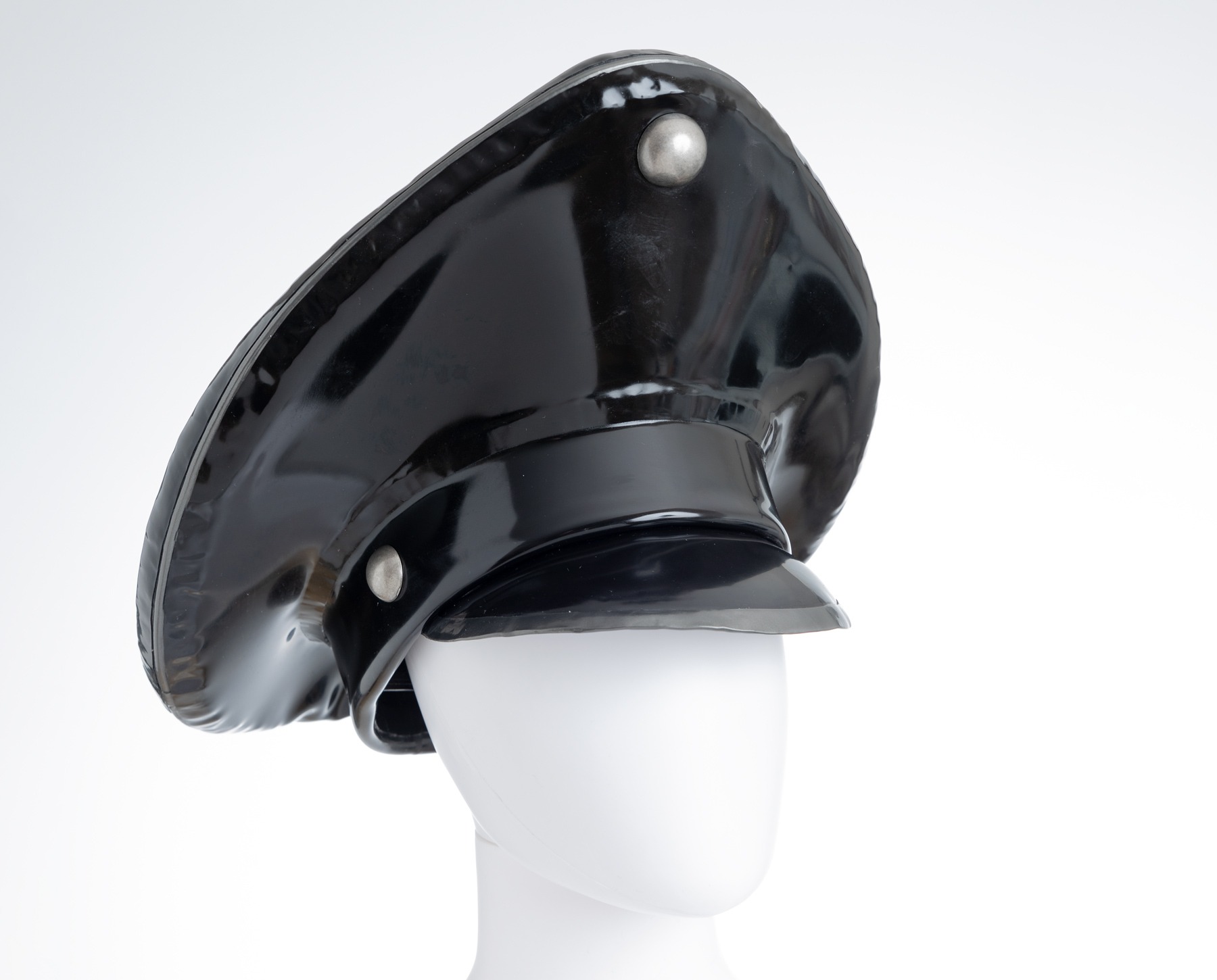 Weiße Gasmaske mit Strass Steine und einem schwarzen Latex Horn.